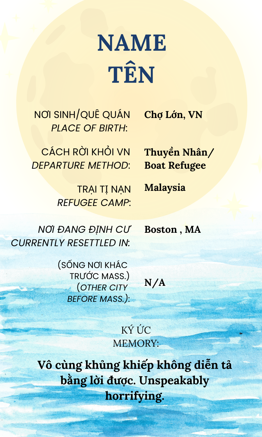 Credit: Dorothy Bui, Angelina Nguyen, Linh Phuong-Vu, Son Ca Lam, John Vo, AsAmSt 294 Class Spring ‘25The refugee journey cards here are real composites of refugee journeys based on archival data, oral histories, and government records. This process turns the visitor into a cartographer of memory - mapping global displacement, loss, and resilience.